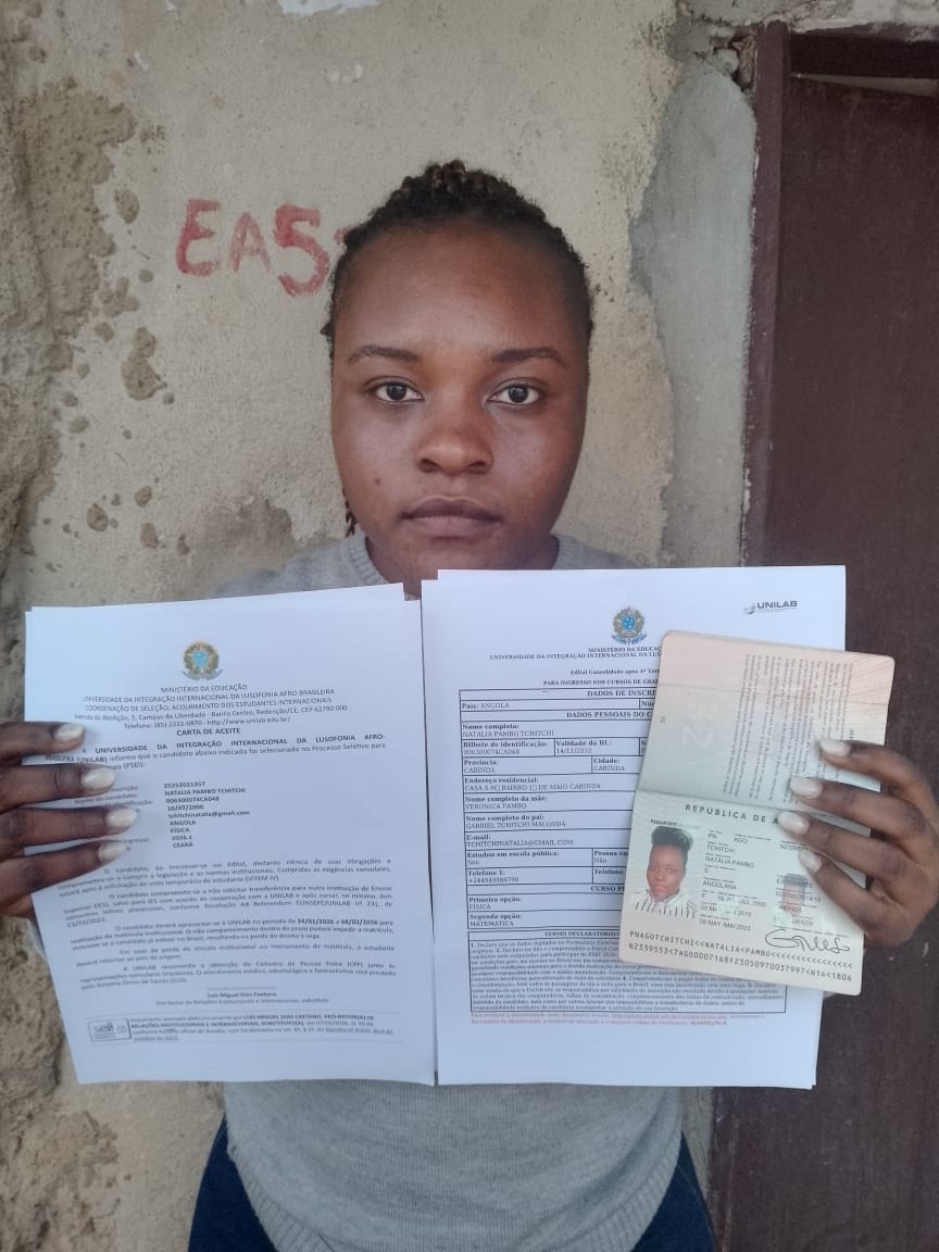 Sou Natália Tchitchi tenho 25 anos de idade,vivo em Luanda,fui selecionada na bolsa da Unilab no curso de Física,preciso de apoio para o viso e passagem aérea para Brasil(Ceará).Tenho até 8 de Fevereiro de 2026 para estar presente no Brasil senão perco bolsa de estudo.Ajudam-me!