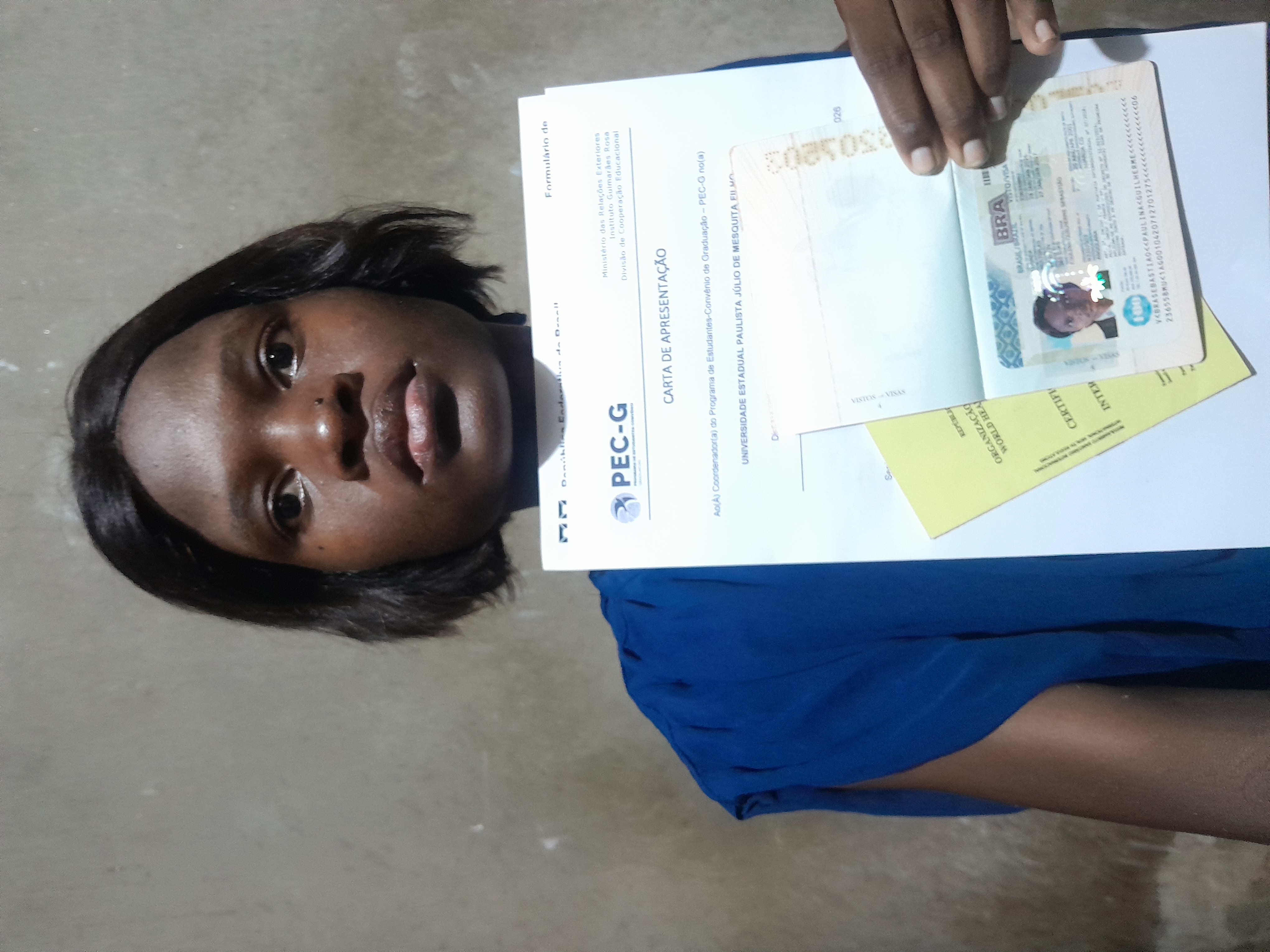 No ano de 2025, candidatei-me novamente a várias bolsas de estudo e, graças a Deus, fui contemplada com uma bolsa do Programa de Estudantes-Convénio de Graduação (PEC-G). Fui admitida pela Universidade Estadual Paulista Júlio de Mesquita Filho (UNESP), em São Paulo, para frequentar o curso de Direito, com início previsto para o primeiro semestre de 2026, no dia 5 de março.